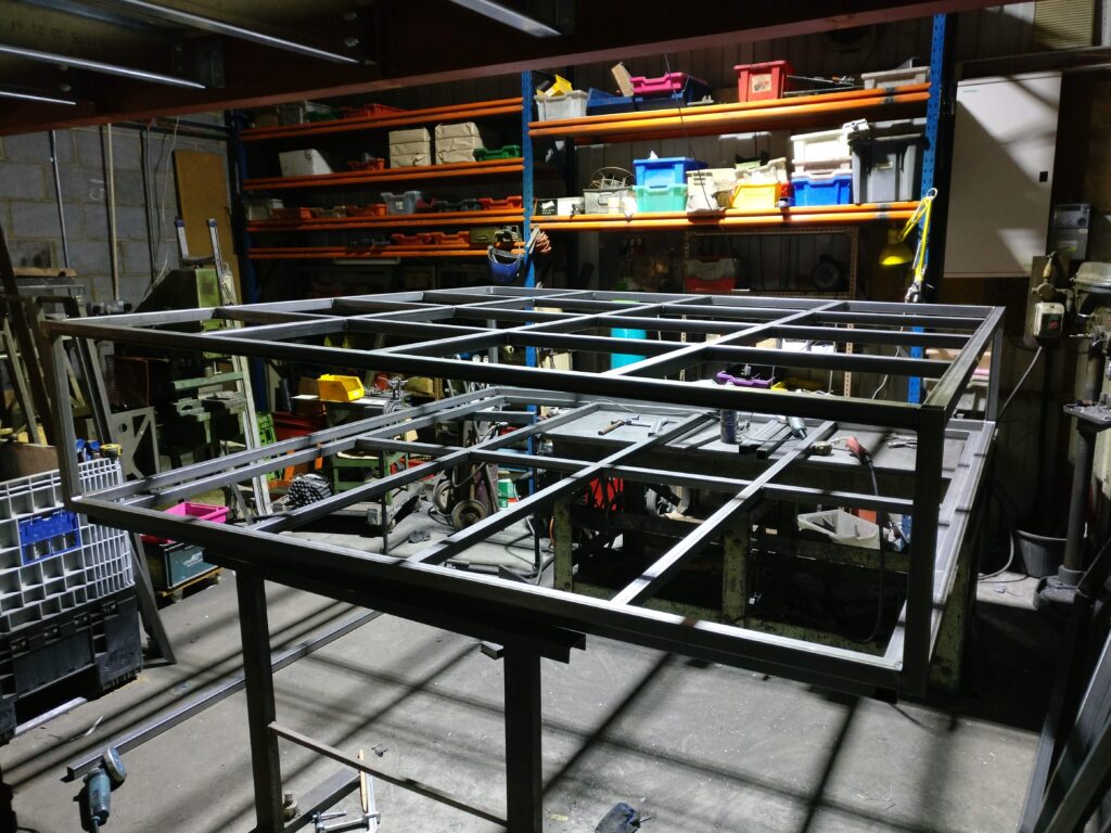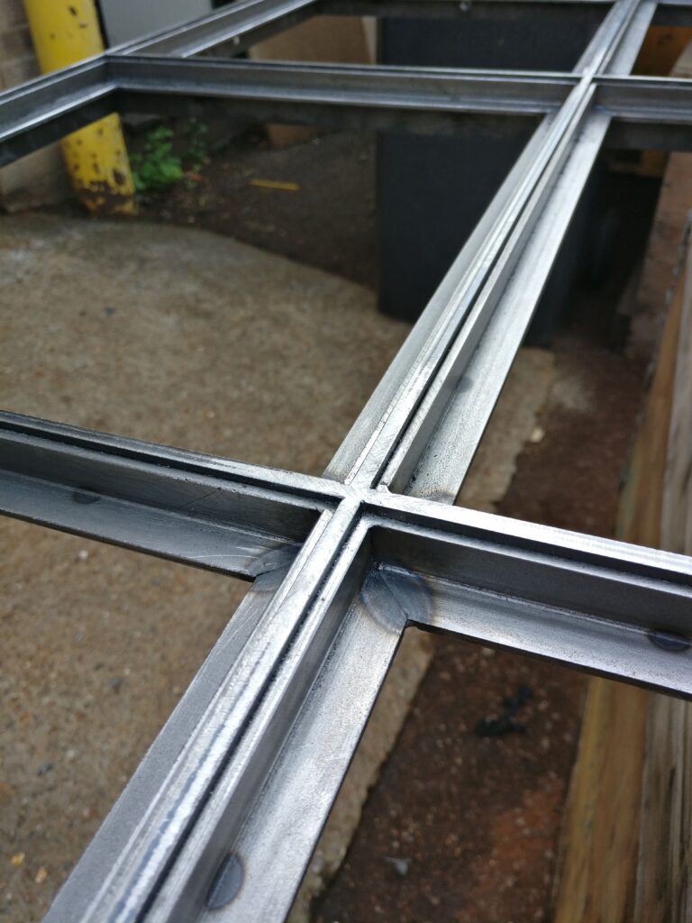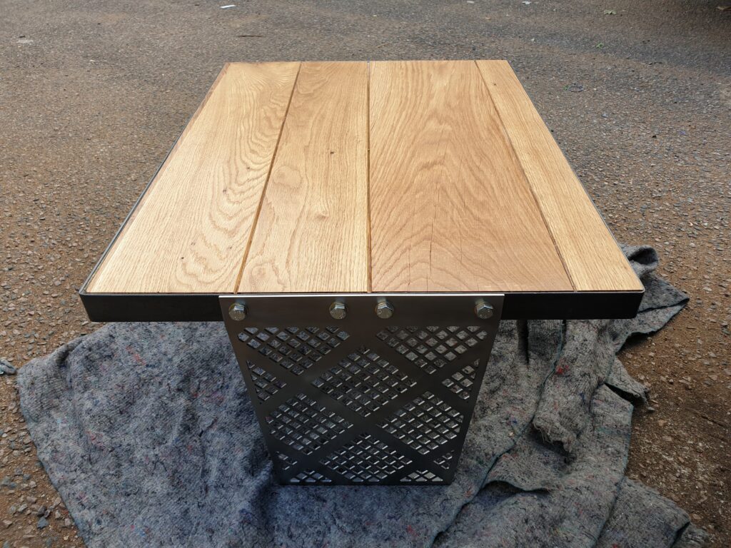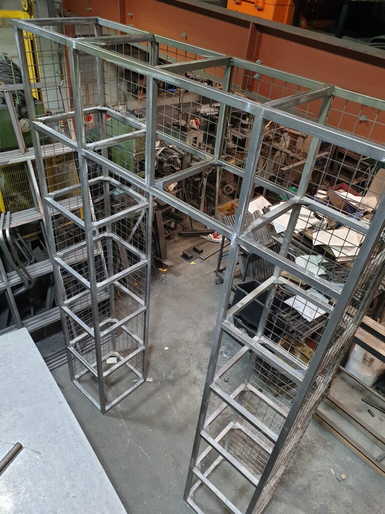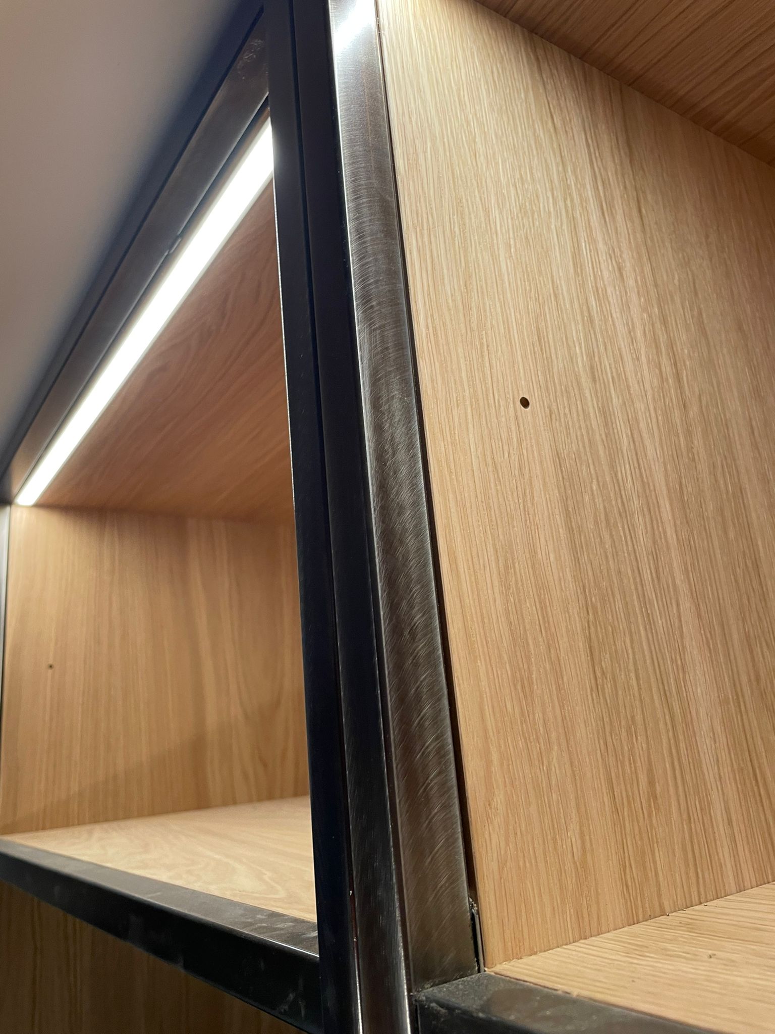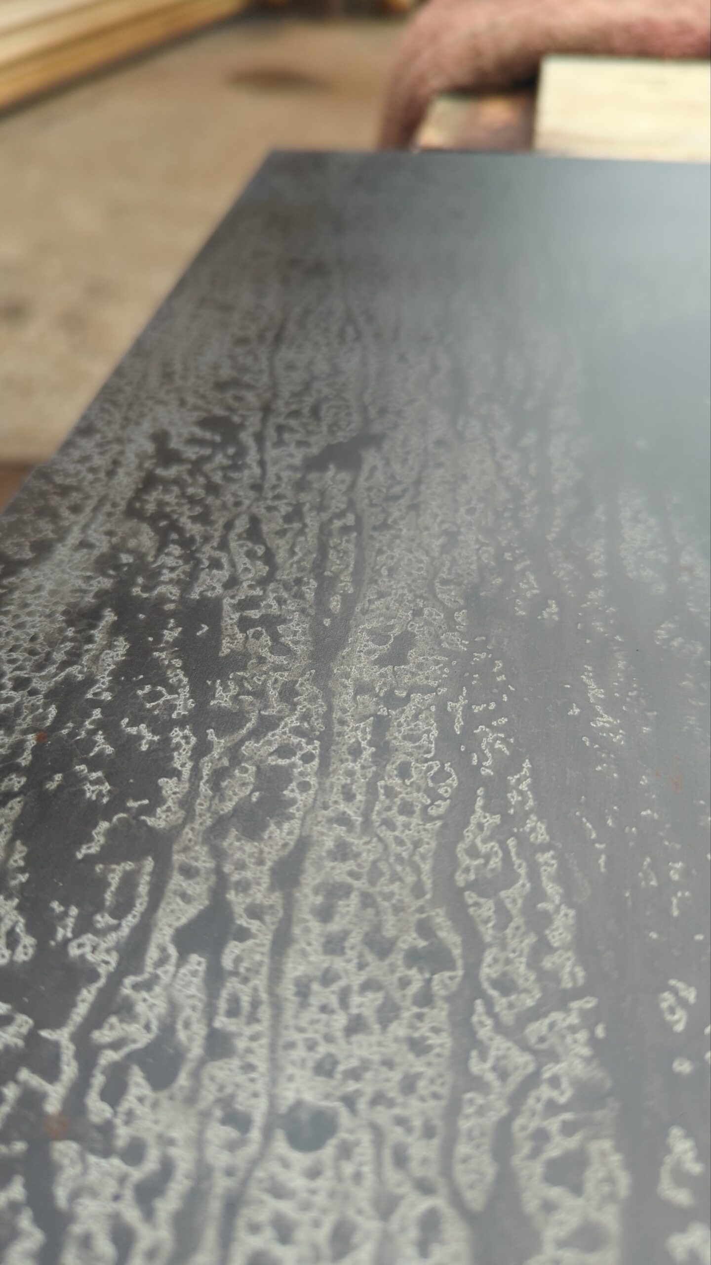 The shelving patination was achieved through a chemical bluing process – this produces a subtle blue colour