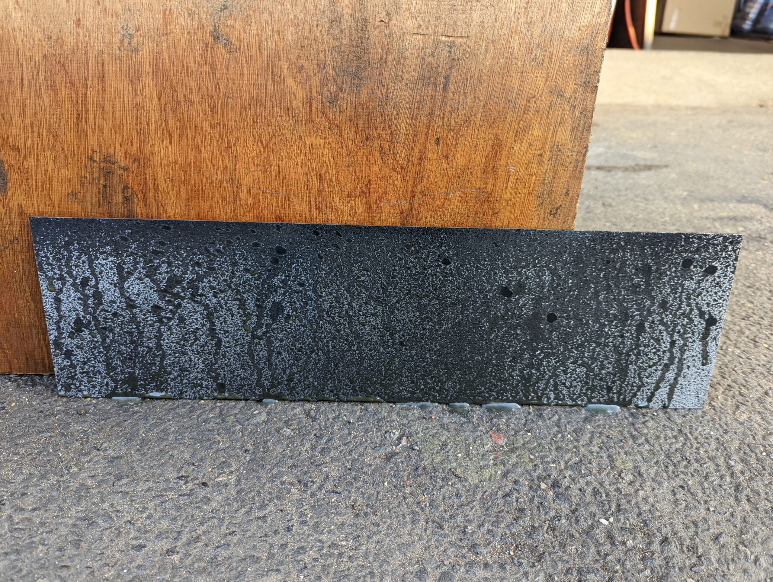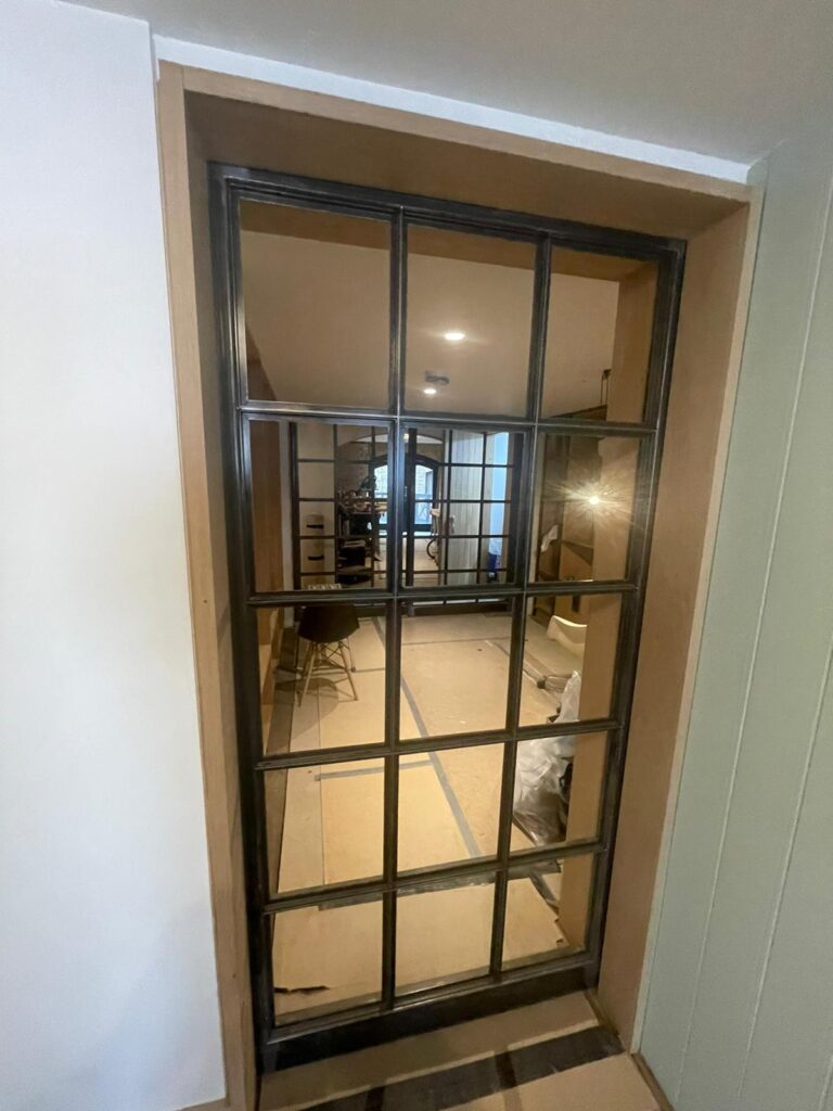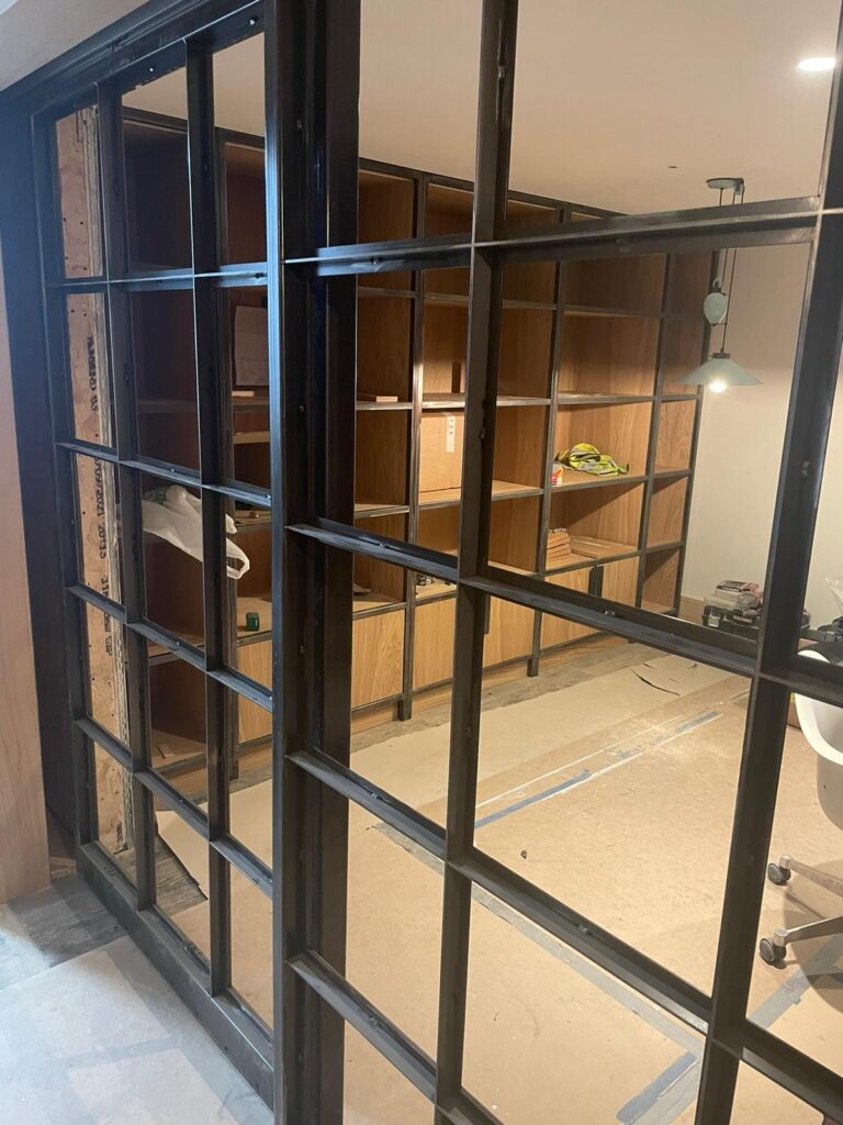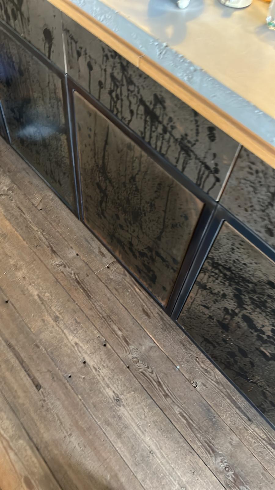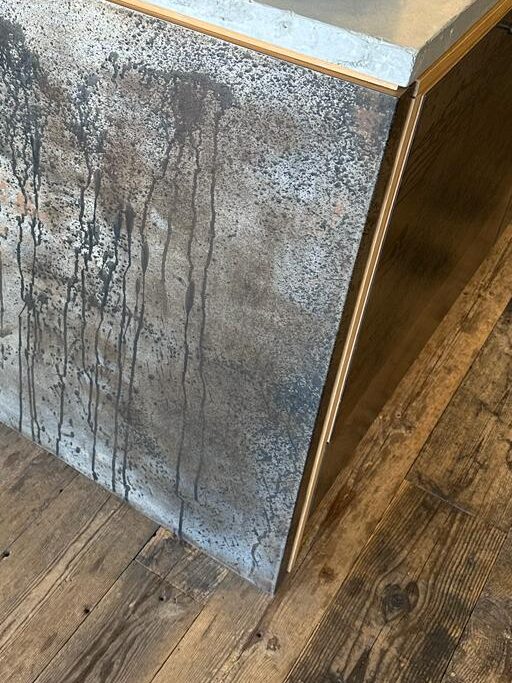 Working closely with the architect we were given the opportunity to experiment with techniques for producing patination on panels for kitchen units and shelving capping